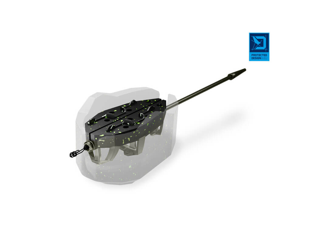 Die Form ist für eine schnelle Handhabung und ein möglichst einfaches Entnehmen aus dem Futterkorb ausgelegt. Zwei markante seitliche Vorsprünge und eine speziell profilierte Unterseite mit den Rillen und dem Delphin-Logo tragen zur reibungslosen Handhabung bei. Diese Elemente zeigen genau die ideale Stelle zum Zusammendrücken an, wodurch ein unerwünschtes Zerfallen der Futtermasse beim Auskippen verhindert wird. Die Gesamtform und Größe der Form sind so konzipiert, dass sie perfekt auf das Futterkorbmodell Delphin Method QUIX XL passen, aber dank ihres universellen Designs können Sie sie problemlos auch mit anderen handelsüblichen Method-Feeder-Futterkörben dieser Größe verwenden.