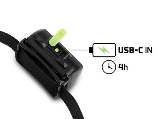 Die Stirnlampe verfügt über einen integrierten 1200-mAh-Akku, der über ein USB-C-Kabel aufgeladen wird. Der Ladevorgang dauert ca. 4 Stunden. Am Gehäuse der Stirnlampe befindet sich eine Akkuanzeige, die den aktuellen Ladezustand anzeigt.