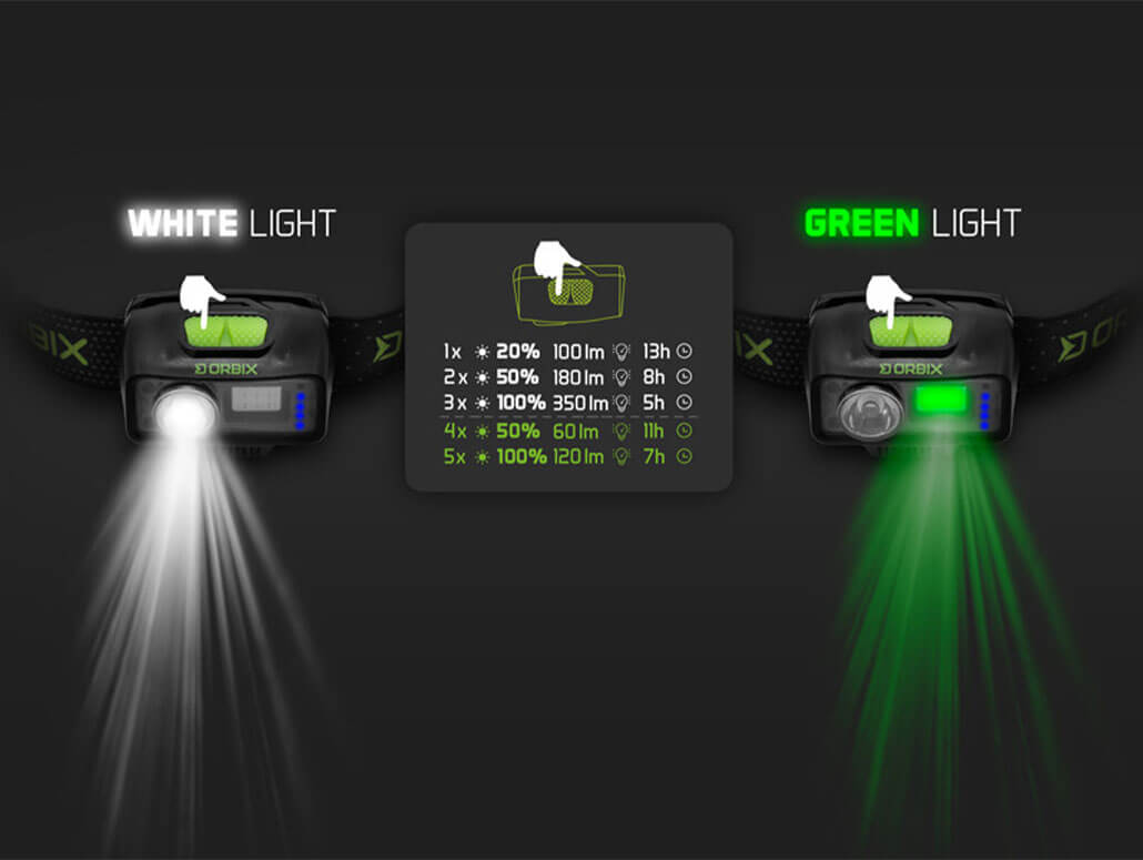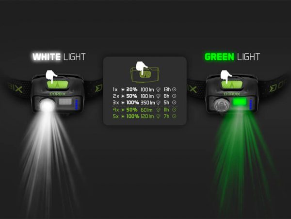 Die Stirnlampe verfügt über zwei LEDs, die weißes oder grünes Licht bieten. Beim ersten Drücken des Schaltknopfes leuchtet ein weißes Licht mit einer Intensität von 20 % (100 lm), wobei die Batterie 13 Stunden hält. Durch wiederholtes Drücken wird der 50 %-Modus mit einer Betriebsdauer von 8 Stunden aktiviert, und beim dritten Drücken leuchtet das weiße Licht mit 100 % Helligkeit, wobei die Batterie 5 Stunden lang hält.
