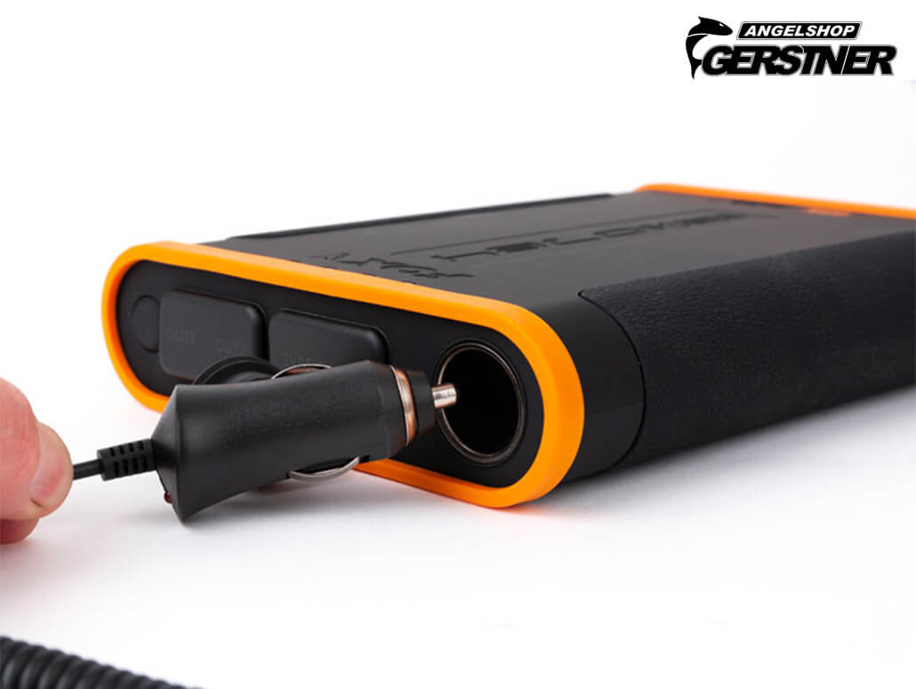 • Inklusive Ladegerät, Adapterstecker und zwei Halterungen, womit man den Akkupack platzsparend an die Seite des Bivvy Tables hängen kann